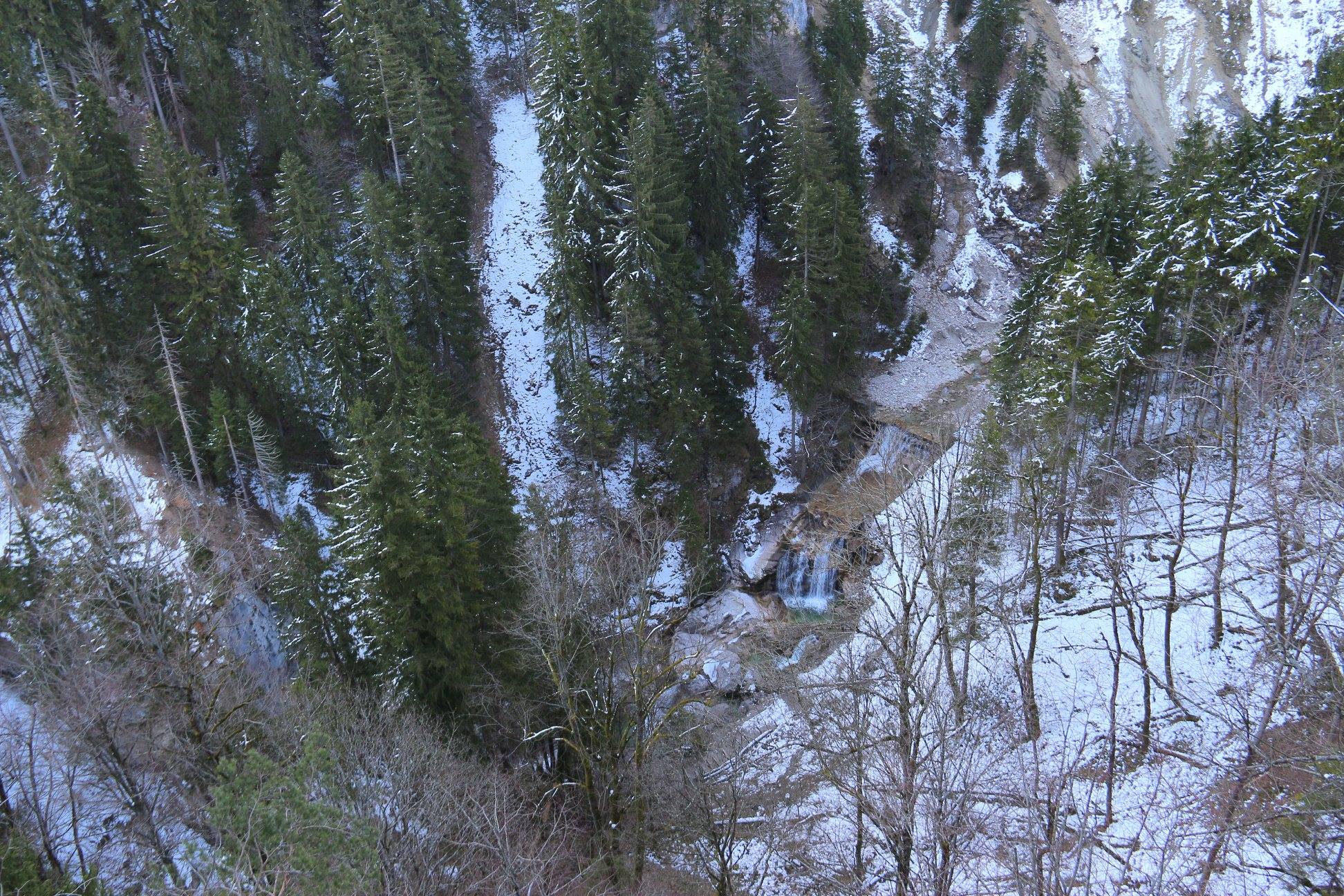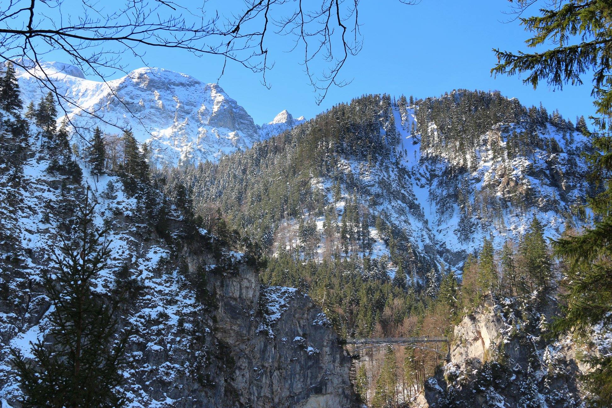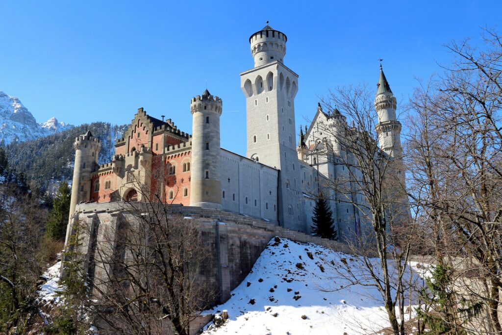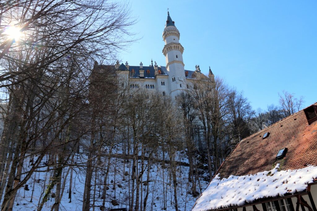 Observando o palácio de diversos ângulos é que podemos perceber a grandeza da majestosa construção e também da natureza que por lá se apresenta. A partir da área lateral do castelo, temos a vista do enorme morro nevado e com vegetação local. Além disso, chama a atenção nos registros a ponte Marienbrücke que, devido a densa neve, permaneceu fechada durante o período da viagem. Lembrando que as fotografias foram tiradas em abril, ou seja, durante a primavera.