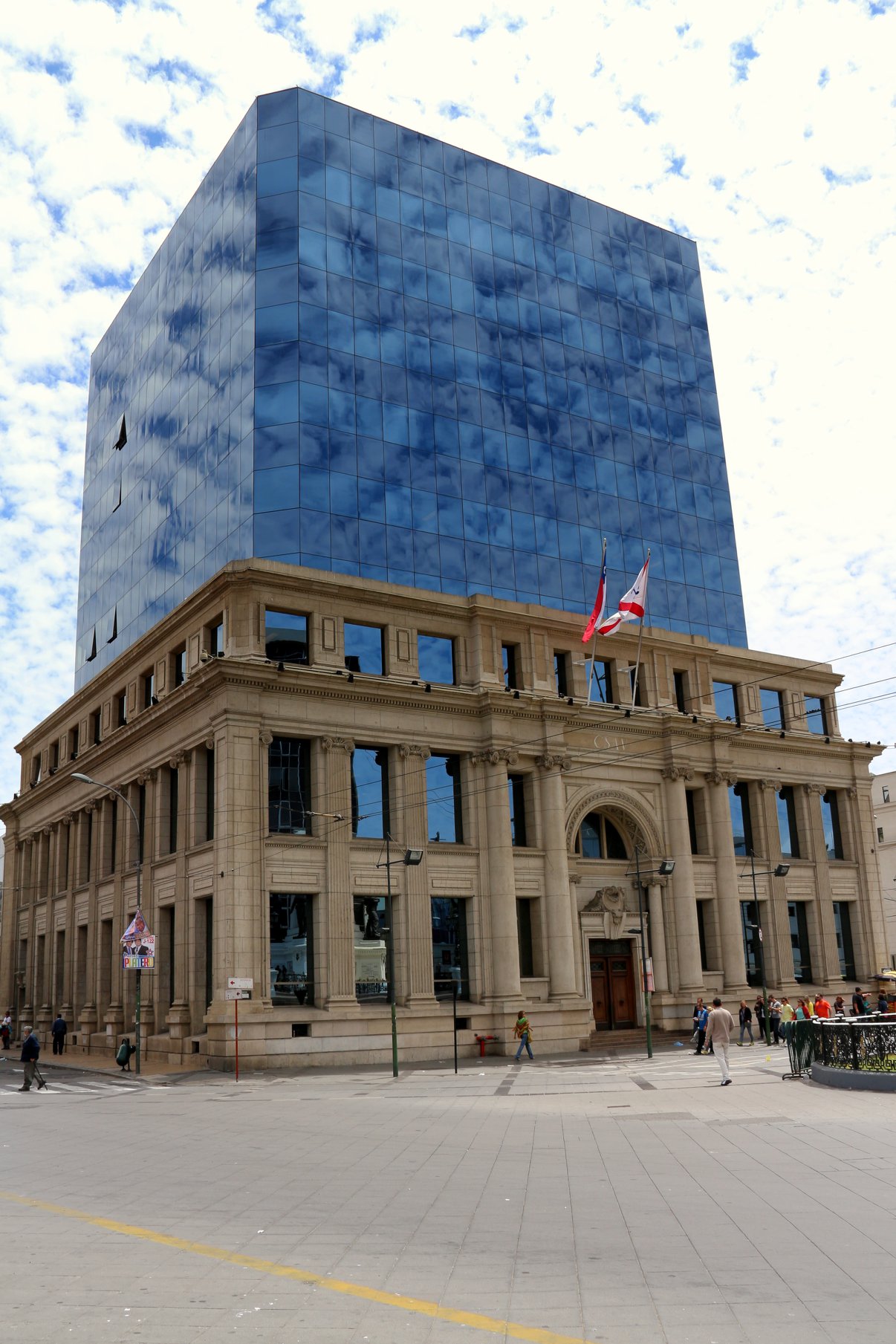 Outra particularidade da Plaza Sotomayor é a arquitetura dos prédios do entorno que misturam o moderno com o antigo. O edifício que chama a atenção para esse detalhe é o da Compañia Sudamericana de Vapores. Parte da enorme estrutura é formada por vidraças que refletem as cores e nuvens do céu.