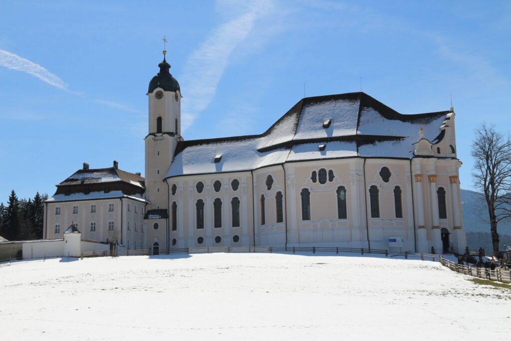 Patrimônio Mundial da UNESCO, a igreja Wieskirche está localizada a 22 quilômetros de Füssen, no sudoeste da Baviera. A imponência da fachada da Wieskirche, que forma uma imagem inesquecível junto com neve da estação, guarda uma história importante. Contam que dois monges construíram uma estátua de Cristo nomeada como o Salvador Torturado, em 1730. Anos mais tarde, uma camponesa viu lágrimas escorrem pelos olhos da estátua, um verdadeiro milagre. Inúmeros fiéis se deslocaram desde cidades vizinhas para ver de perto a famosa imagem.